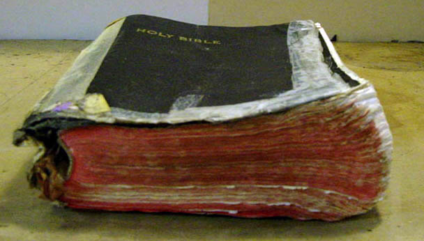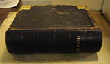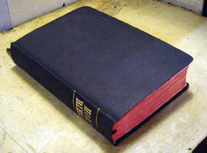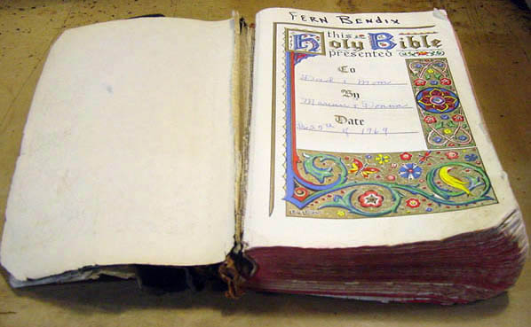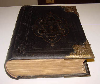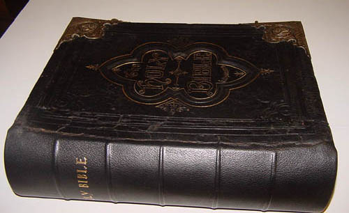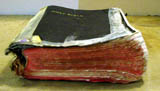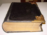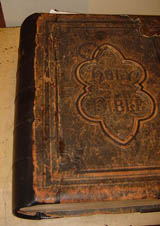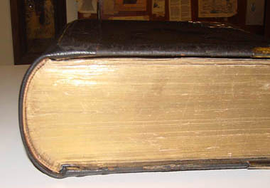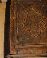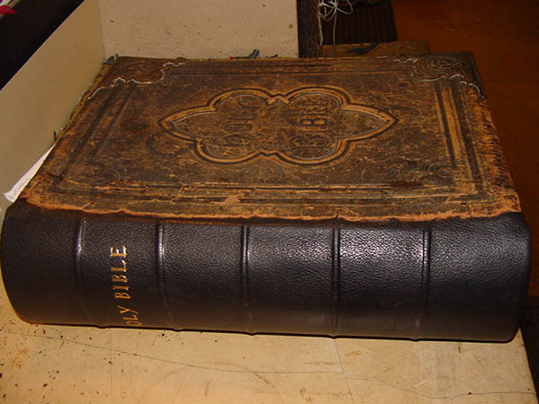 Below is an example of a large "Family Bible" that we often see in our shop for restoration or repair. Typically the spine has fallen off completely or is only attached to one cover. Sometimes we can save and reattach the spine.