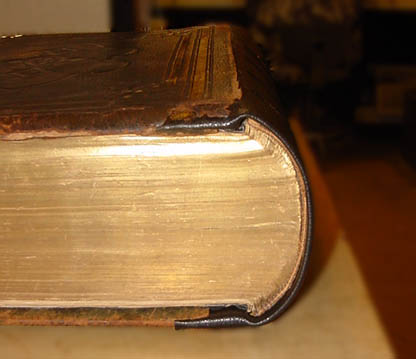 BELOW: These photos were taken after the original cover was dyed and some leather dressing was applied to reinvigorate the original leather somewhat. After dying it's very difficult to notice where the new spine stops and the original cover begins.