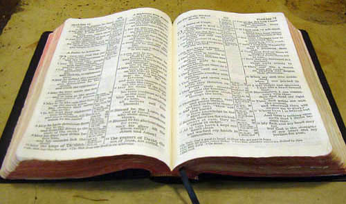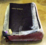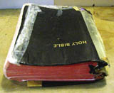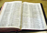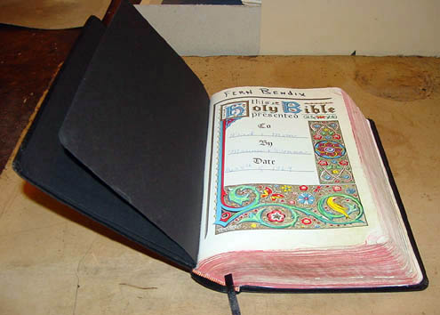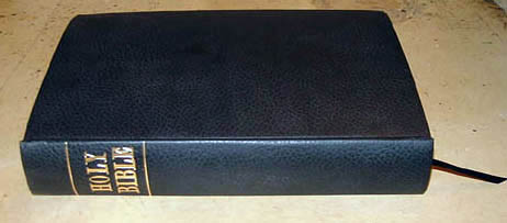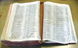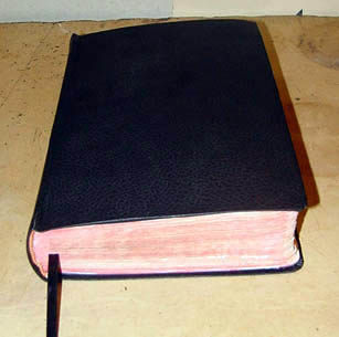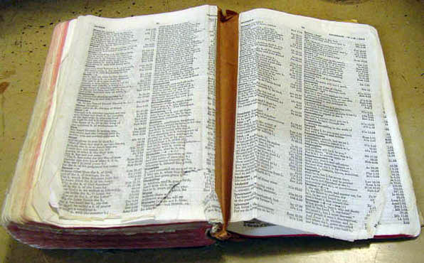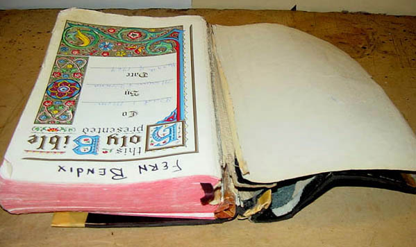RIGHT: This Bible is one that came to us well used. We rebound the entire text block, added a new ribbon, made a new flex cover, removed tape and repaired pages where necessary for page attachment. We didn't repair every little tare although we did smooth out the dog-eared corners.