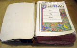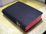 LEFT: Here is the completed book. The spine is no longer concave and the tape was successfully removed. In this case the customer asked for spine stamping only on the new cover. The imitation leather was wrapped around thin boards to make a flexible cover similar to the original.